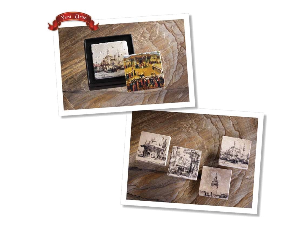 Dual Stone Coaster 'Istanbul' Product Size 100 x 100 x 10 mm Gift of Carton Double Gift Set original Travertine Stone Coaster on Nostalgic Color and B / W Istanbul Engraved with Image